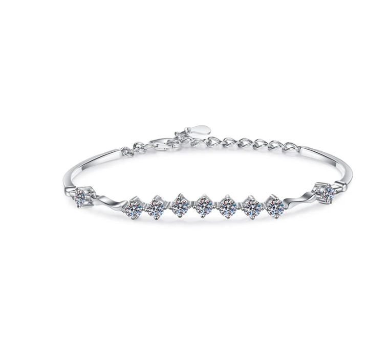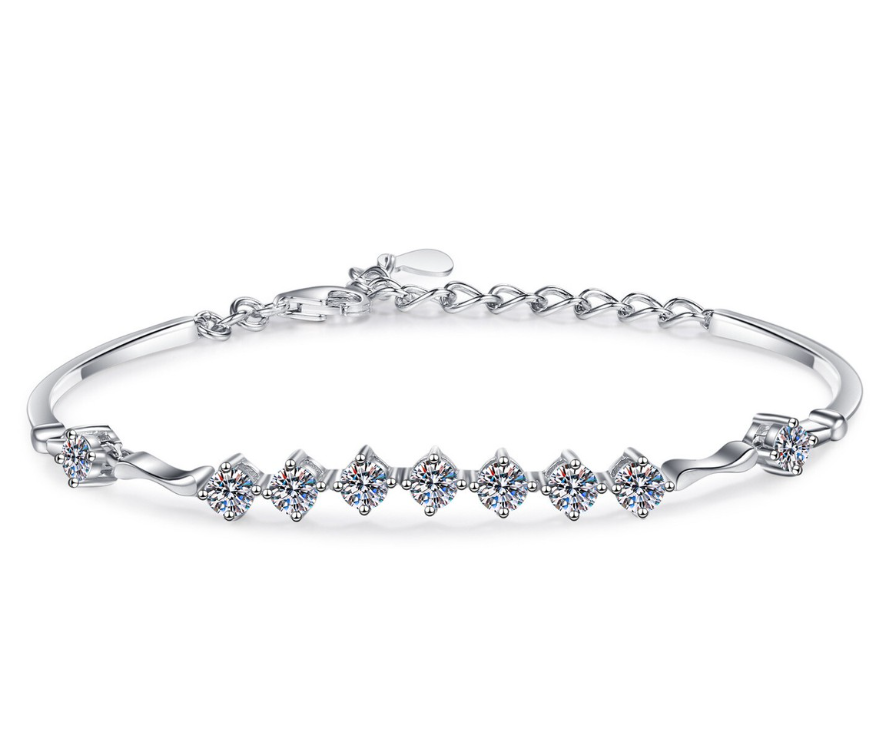 這款優雅的純銀手鏈鑲嵌璀璨的莫桑石寶石,以流暢鏈節展現閃耀光芒與典雅風格。採用防敏S925純銀打造,光澤細膩持久;莫桑石來自合倫理實驗室,焕發卓越光彩,為日常穿搭或特別時刻增添不朽魅力。