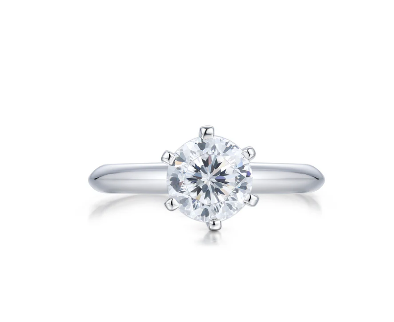 這款精緻的K金經典六爪莫桑石戒指,以六根優雅爪釘牢牢托起璀璨圓形莫桑石,搭配光滑戒身及高級K金工藝,閃耀而堅固,融合低調優雅與耐久品質,是慶賀人生里程碑或日常佩戴的完美之選。